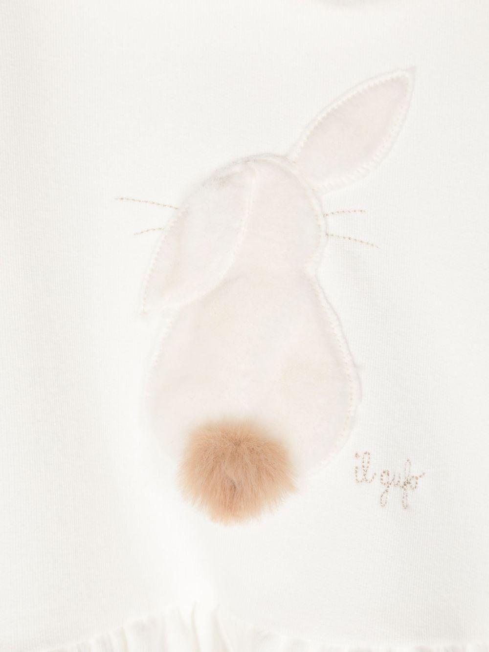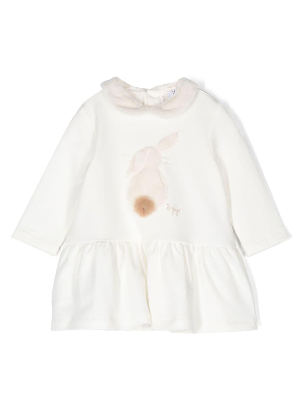 White Il Gufo embroidered logo dress for girls with rabbit applique