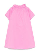 The Il Gufo fuchsia poplin dress for girls is available on the RubinoKids.com online store. Made of 100% cotton, it features a fuchsia color, an elastic waistband, a ruffled collar, and short raglan sleeves. Available in various sizes, it is part of the Il Gufo Spring/Summer 2025 collection and is available for immediate shipment with delivery within 24-48 hours in Italy.