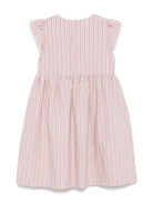 The Il Gufo pink dress for girls with vertical stripes is available on the RubinoKids.com online store. Made of 100% cotton, it features a pink color, a back button closure, a crew neck, ruffled details, and a fully lined design. Available in various sizes, it is part of the Il Gufo Spring/Summer 2025 collection and is available for immediate shipment with delivery within 24-48 hours in Italy.