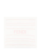 The Fendi Kids white baby blanket with embroidery and pink logo is available on the RubinoKids.com online store. Made of 100% cotton, it features a white color, pink stripes, an embroidered logo, and a square shape. It is part of the Fendi Kids Spring/Summer 2025 collection and is available for immediate shipment with delivery within 24-48 hours in Italy.