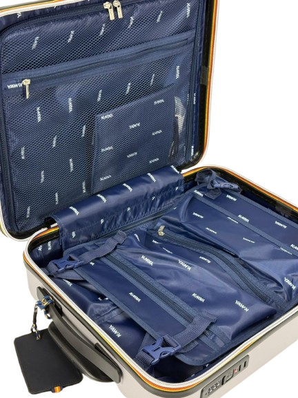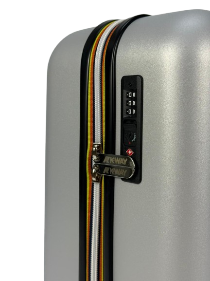The K-Way Kids Eudoxie Logo trolley for children in grey with swivel wheels is available on the RubinoKids.com online store. Made of 100% polycarbonate, this grey hardside carry-on suitcase features a polycarbonate shell, a polyester lining with an all-over logo print, a removable divider panel with mesh inserts, a small zip pocket, a drawstring laundry bag, four 360° swivel wheels, an extendable aluminium handle, a TSA combination lock, a luggage tag, and a tone-on-tone embossed K-Way monogram. Part of the K-Way Kids Fall/Winter 2025 collection, it is available for 24-48 hour delivery in Italy.