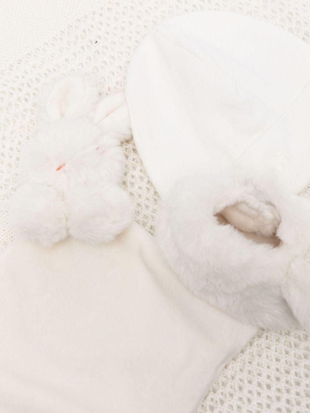 The Bonpoint cream-colored knitted baby set is available on the RubinoKids.com online store. Made of 100% polyester, 58% cotton, and 42% wool, the cream-colored product features a cotton and wool blend, a knitted blanket, matching booties, and a matching hat. It is part of the Bonpoint Fall/Winter 2025 collection and is available for immediate shipment with delivery within 24-48 hours in Italy.