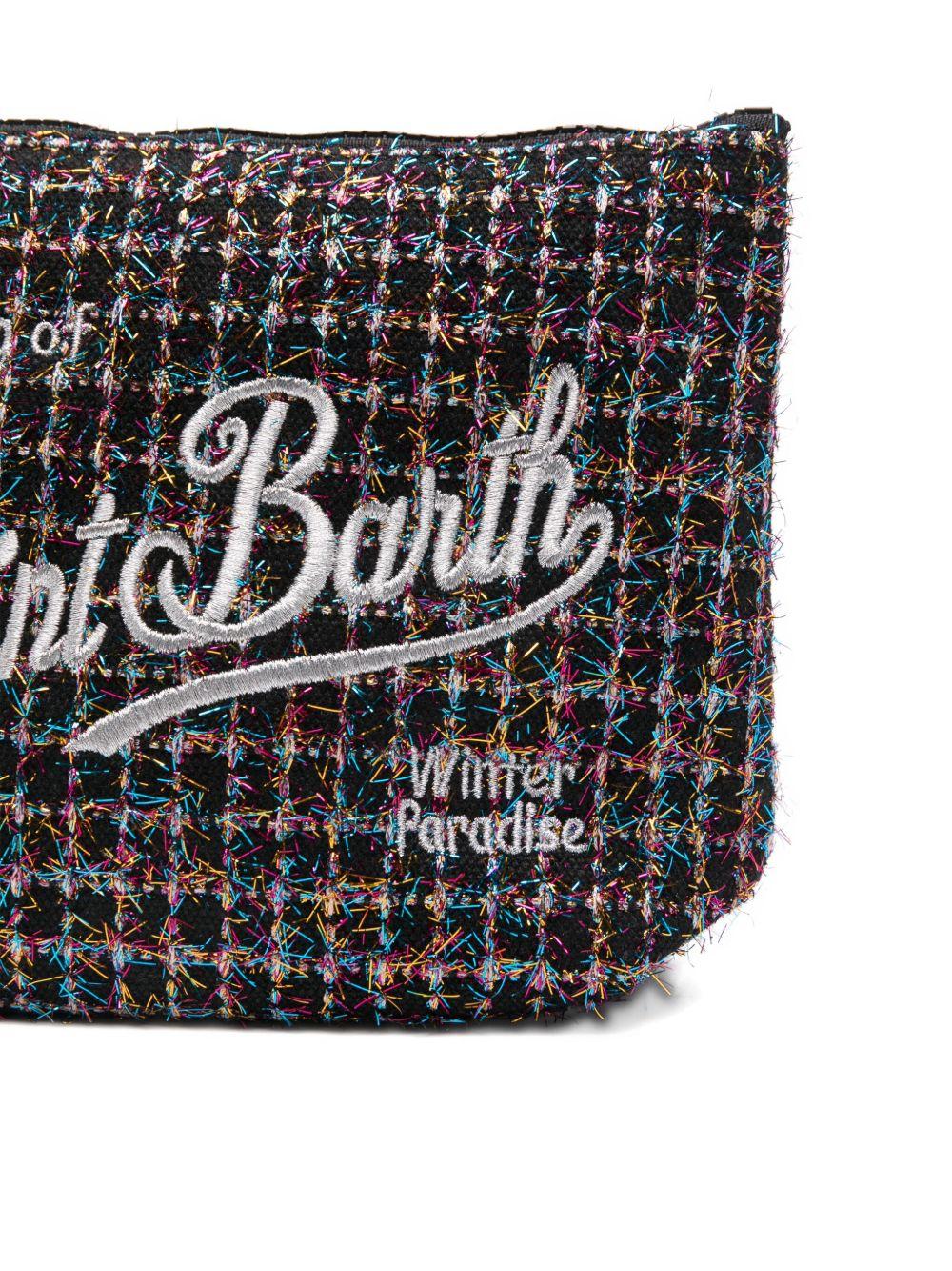 The MC2 Saint Barth Kids Aline clutch bag for girls in black with embroidered logo is available on the RubinoKids.com online store. Made of 70% rubber, 30% polyester, it features a black zip closure, tweed with lurex thread, and an embroidered Saint Barth logo. It is part of the MC2 Saint Barth Kids Fall/Winter 2025 collection and is available for 24/48 hour delivery in Italy.