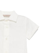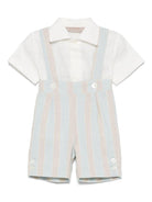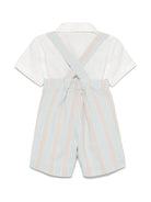 The La Stupenderia white striped baby boy's shorts set is available on the RubinoKids.com online store. Made of 55% linen, 45% cotton, it features a white color, a front button closure, pleated details, a spread collar, and short sleeves. Available in various sizes, it is part of the La Stupenderia Spring/Summer 2025 collection and is available for immediate shipment with delivery within 24-48 hours in Italy.