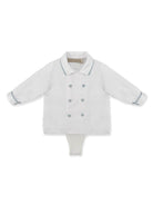 The La Stupenderia baby boy's white and blue velvet-effect shorts set is available on the RubinoKids.com online store. Made of 55% polyester and 45% cotton, the blue velvet-effect cotton set features pleated details, a classic collar, a front button closure, long sleeves, and a pleated hem. Available in various sizes, it is part of the La Stupenderia Fall/Winter 2024 collection and is available for immediate shipment with delivery within 24-48 hours in Italy.