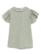 The Donsje Capucine green dress for girls with ruffled details is available on the RubinoKids.com online store. Made of 100% linen, it features a pastel green color, a single button closure at the back, a crew neck, ruffled details, and a keyhole back. Available in various sizes, it is part of the Donsje Spring/Summer 2025 collection and is available for immediate shipment with delivery within 24-48 hours in Italy.