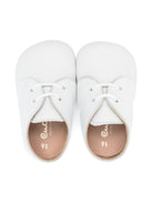 The Eli1957 white baby girl's first steps shoes with logo-embellished leather insoles are available on the RubinoKids.com online store. Made of 100% calfskin, they are white, have a lace-up front fastening, a logo-embellished leather insole, and a flat leather sole. Available in various sizes, they are part of the Eli1957 Spring/Summer 2025 collection and are available for immediate shipment with delivery within 24-48 hours in Italy.