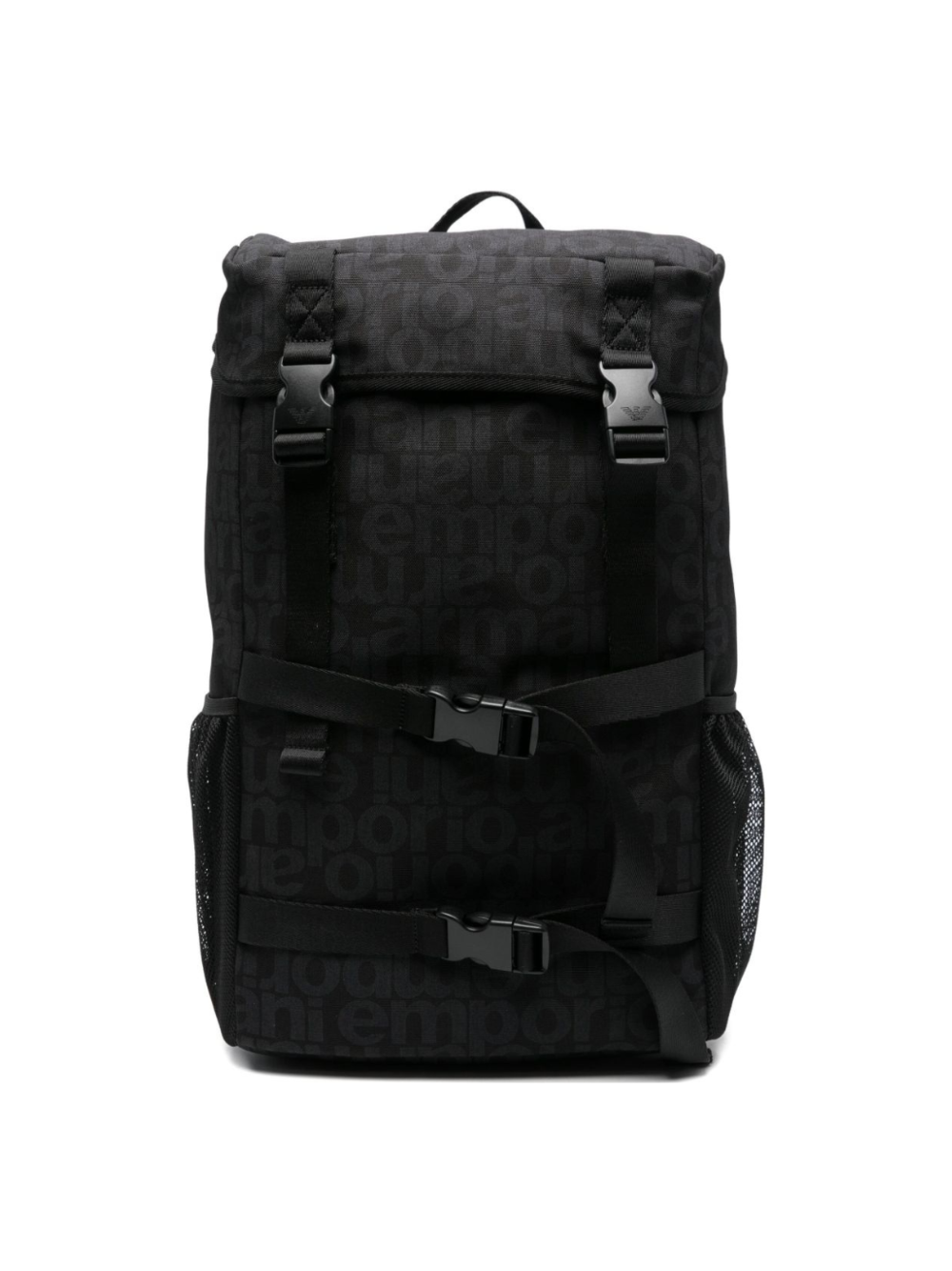 The Emporio Armani Kids blue backpack with all-over logo print is available on the RubinoKids.com online store. Made of 100% polyester, it features a blue color, an all-over logo print, a top buckle closure, a drawstring closure, side mesh pockets, and adjustable shoulder straps. It is part of the Emporio Armani Kids Fall/Winter 2025 collection and is available for 24-48 hour delivery in Italy.