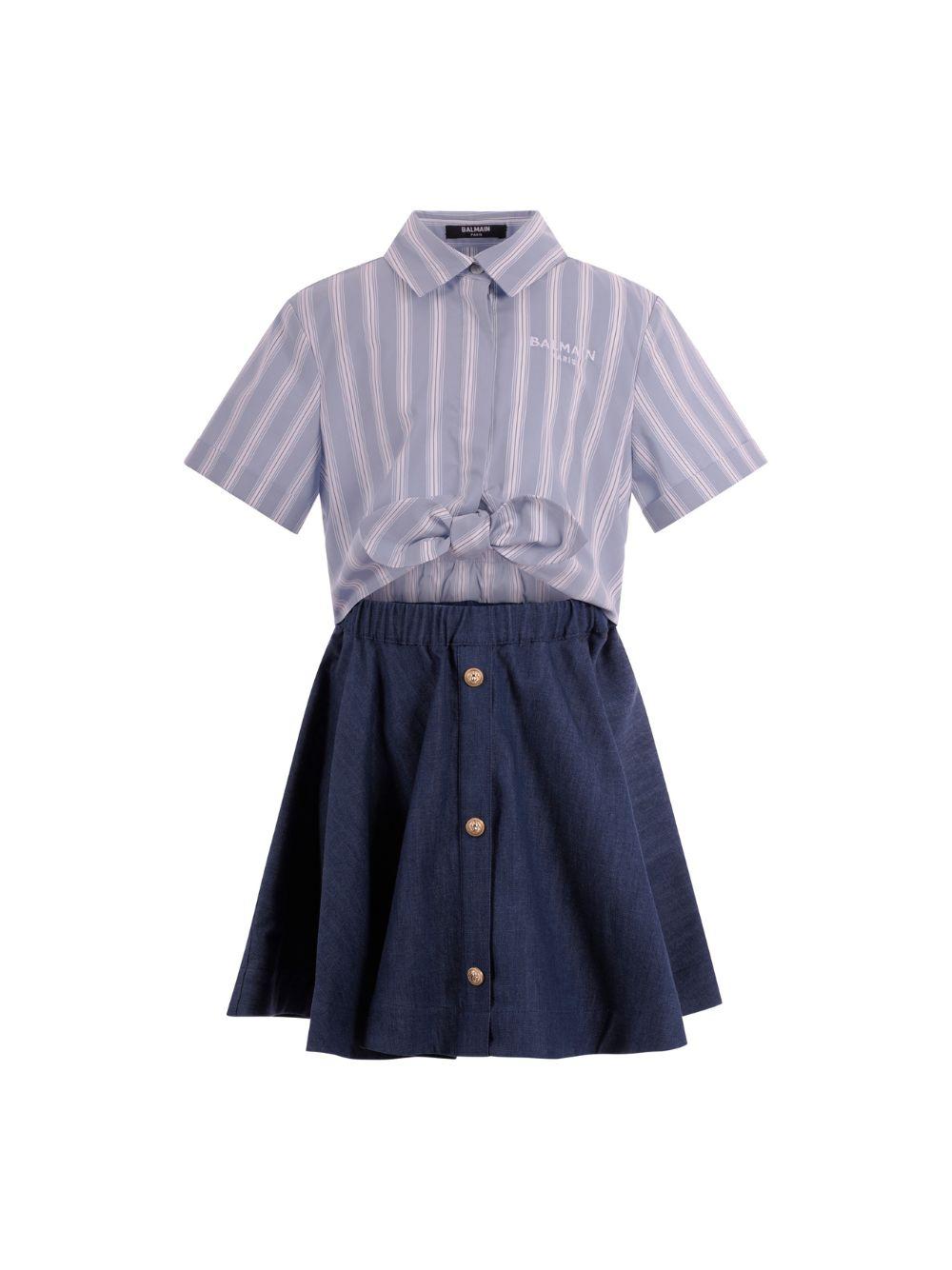 Il prodotto Abito per bambina Balmain Kids multicolor con logo sul davanti è disponibile sullo store online RubinoKids.com. Realizzato in cotone 100%. Il prodotto presenta un colore azzurro/denim, olletto classico, logo sul davanti, chiusura con bottoni sul davanti, dettaglio fiocco, maniche corte, design a righe, gonna con elastico in vita, chiusura con bottoni dorati. Varie taglie a catalogo, appartiene alla collezione Balmain Kids Primavera/Estate 2026 ed é disponibile con consegna in 24/48h per l'Italia.