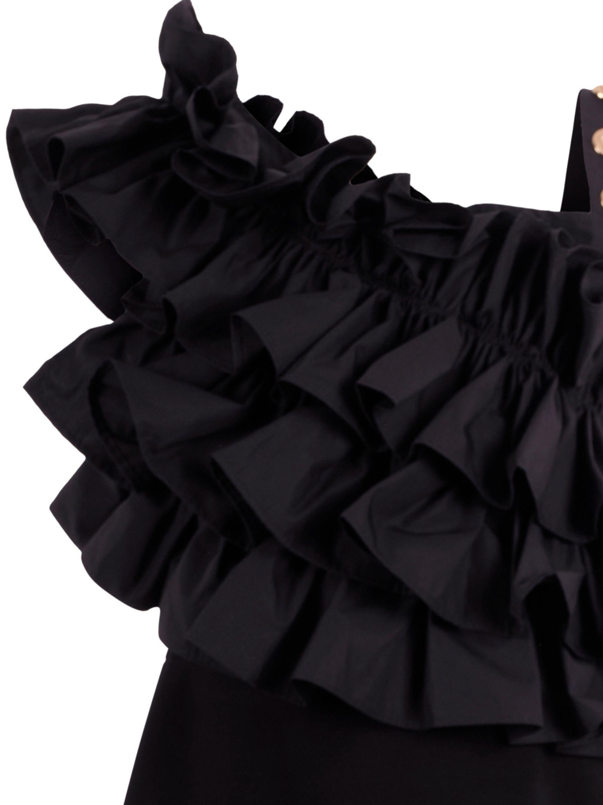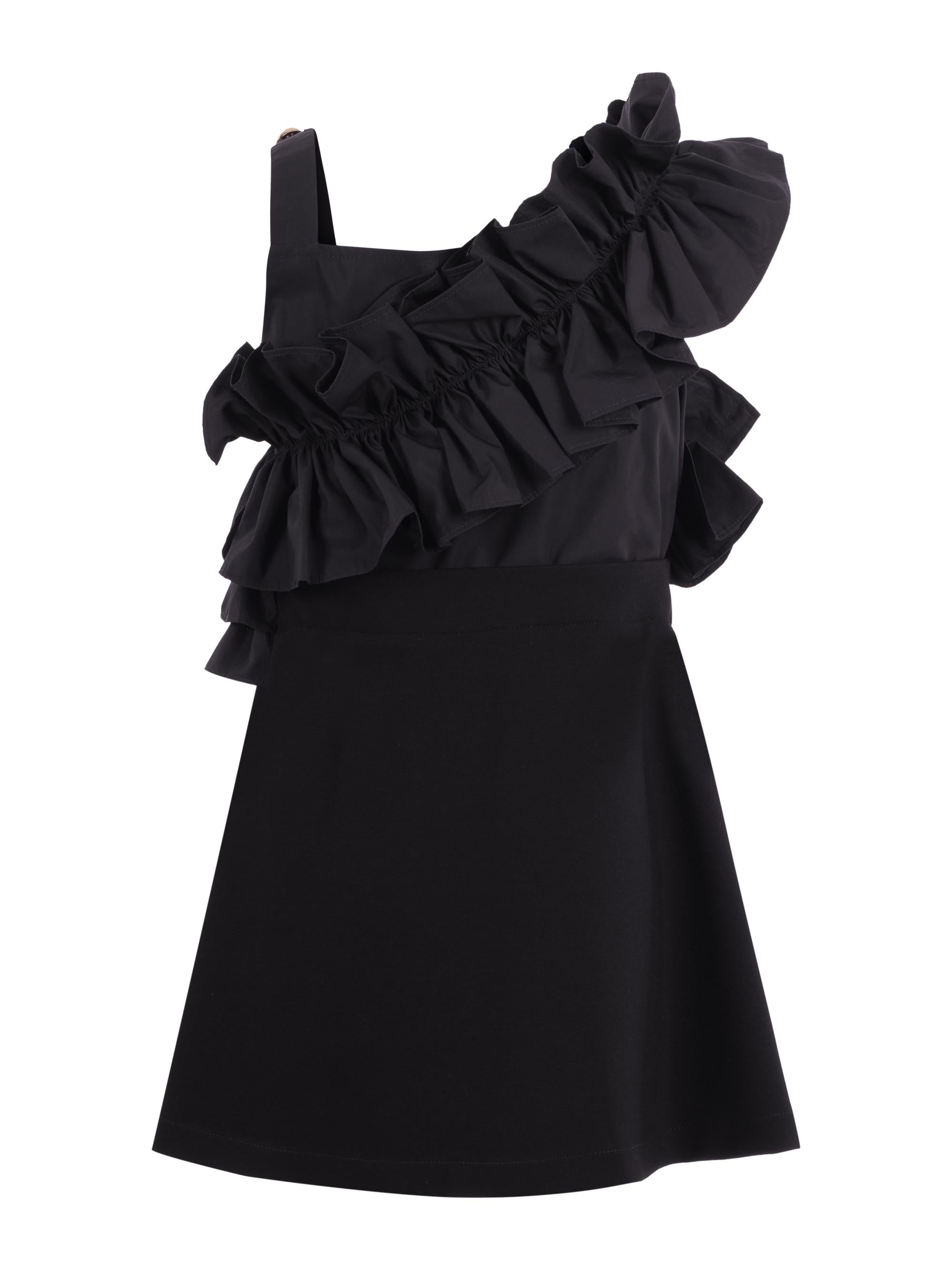 Il prodotto Abito per bambina Balmain Kids nero con ruches è disponibile sullo store online RubinoKids.com. Realizzato in cotone 100%. Il prodotto presenta un colore nero, ruches, bretelle, bottoni dorati, gonna svasata. Varie taglie a catalogo, appartiene alla collezione Balmain Kids Primavera/Estate 2026 ed é disponibile con consegna in 24/48h per l'Italia.