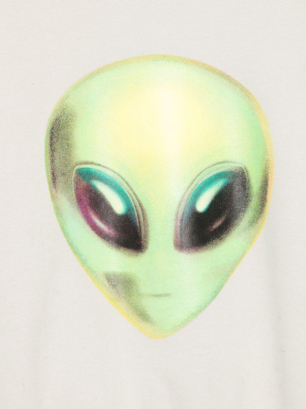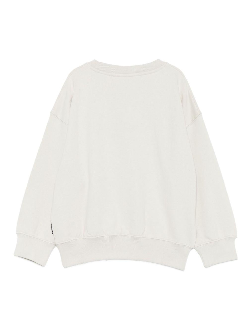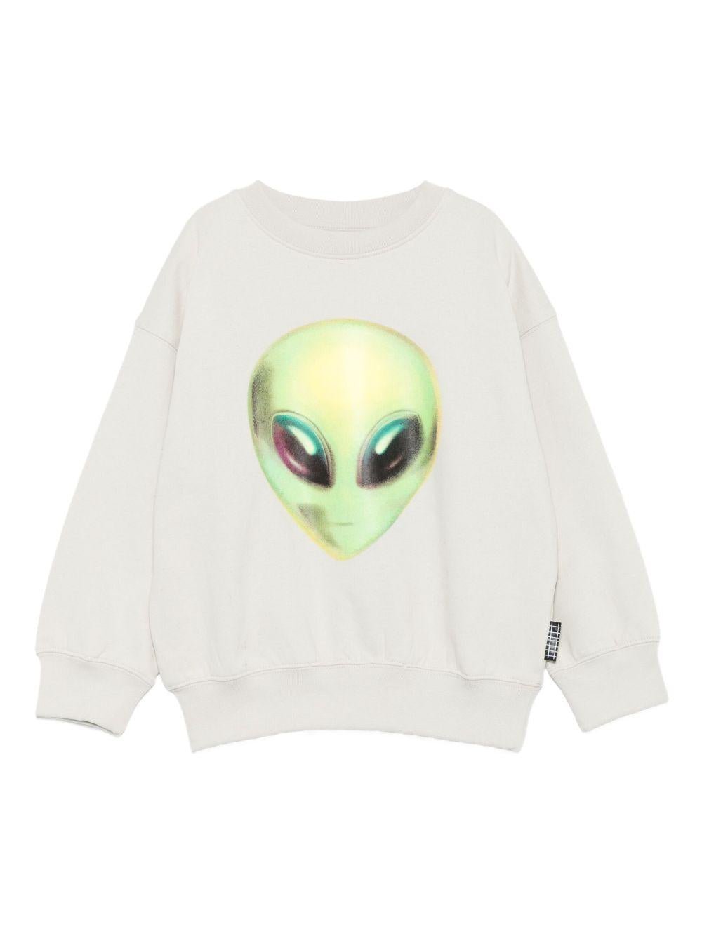 The Molo white sweatshirt for boys with an alien face is available on the RubinoKids.com online store. Made of 80% cotton and 20% polyester, it features a white crew neck, ribbed hem and cuffs, long sleeves, and an alien face. Available in various sizes, it is part of the Etro Kids Fall/Winter 2025 collection and is available for 24-48 hour delivery in Italy.