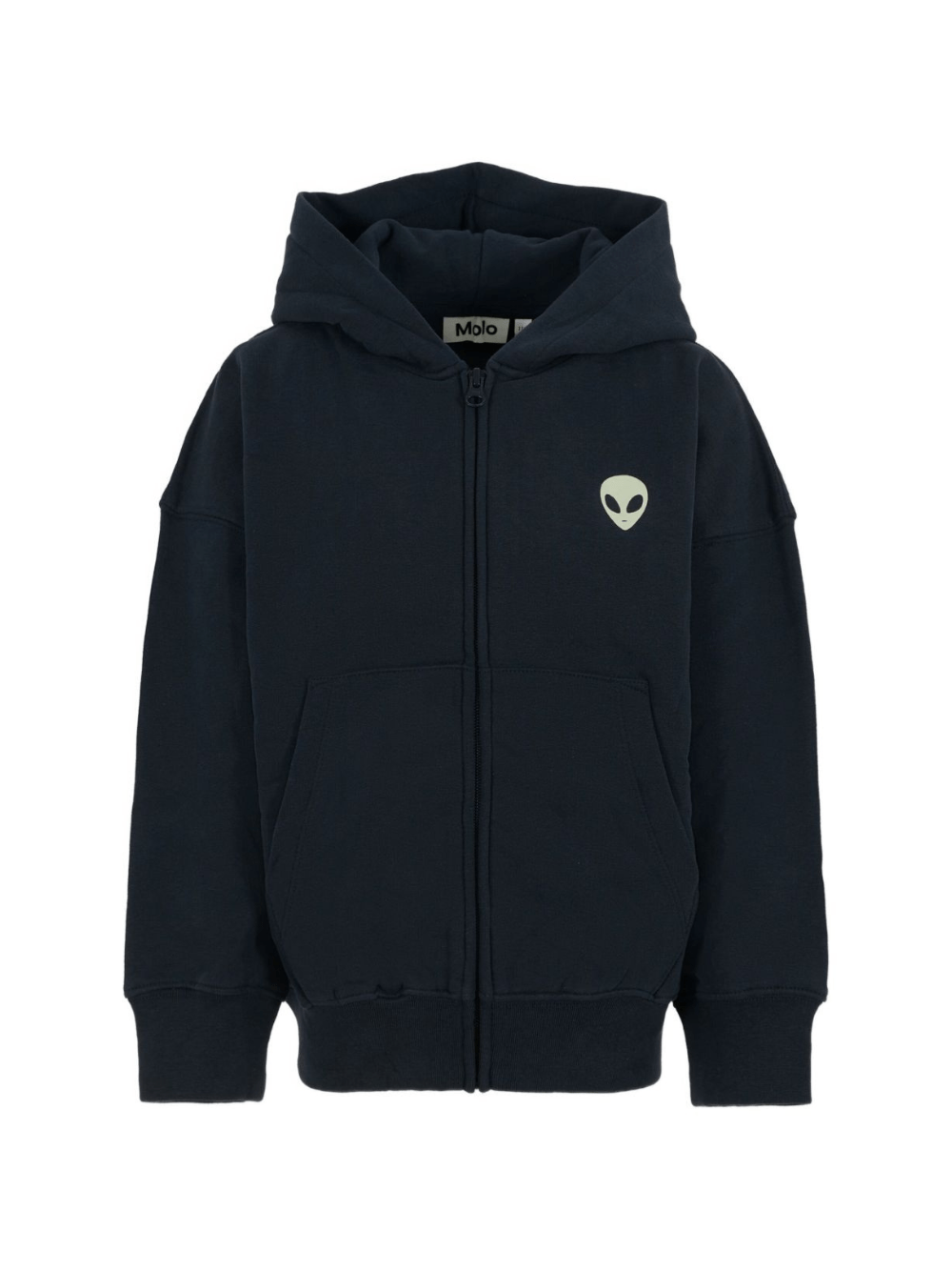 The Molo blue alien print sweatshirt for boys is available on the RubinoKids.com online store. Made of 100% cotton, it features a blue hood, zip closure, long sleeves, an alien face motif, and a cotton blend. Available in various sizes, it is part of the Molo Fall/Winter 2025 collection and is available for 24-48 hour delivery in Italy.