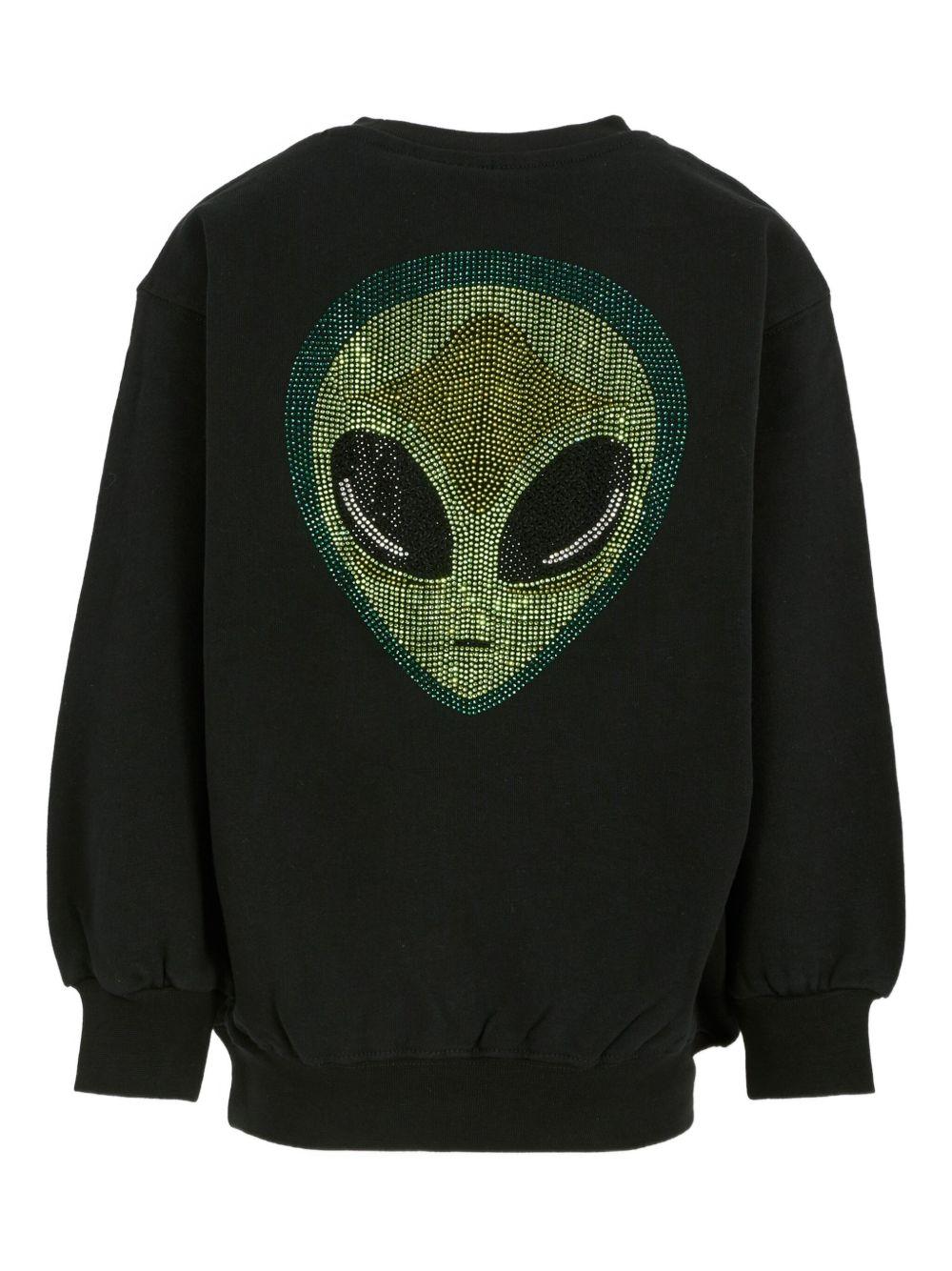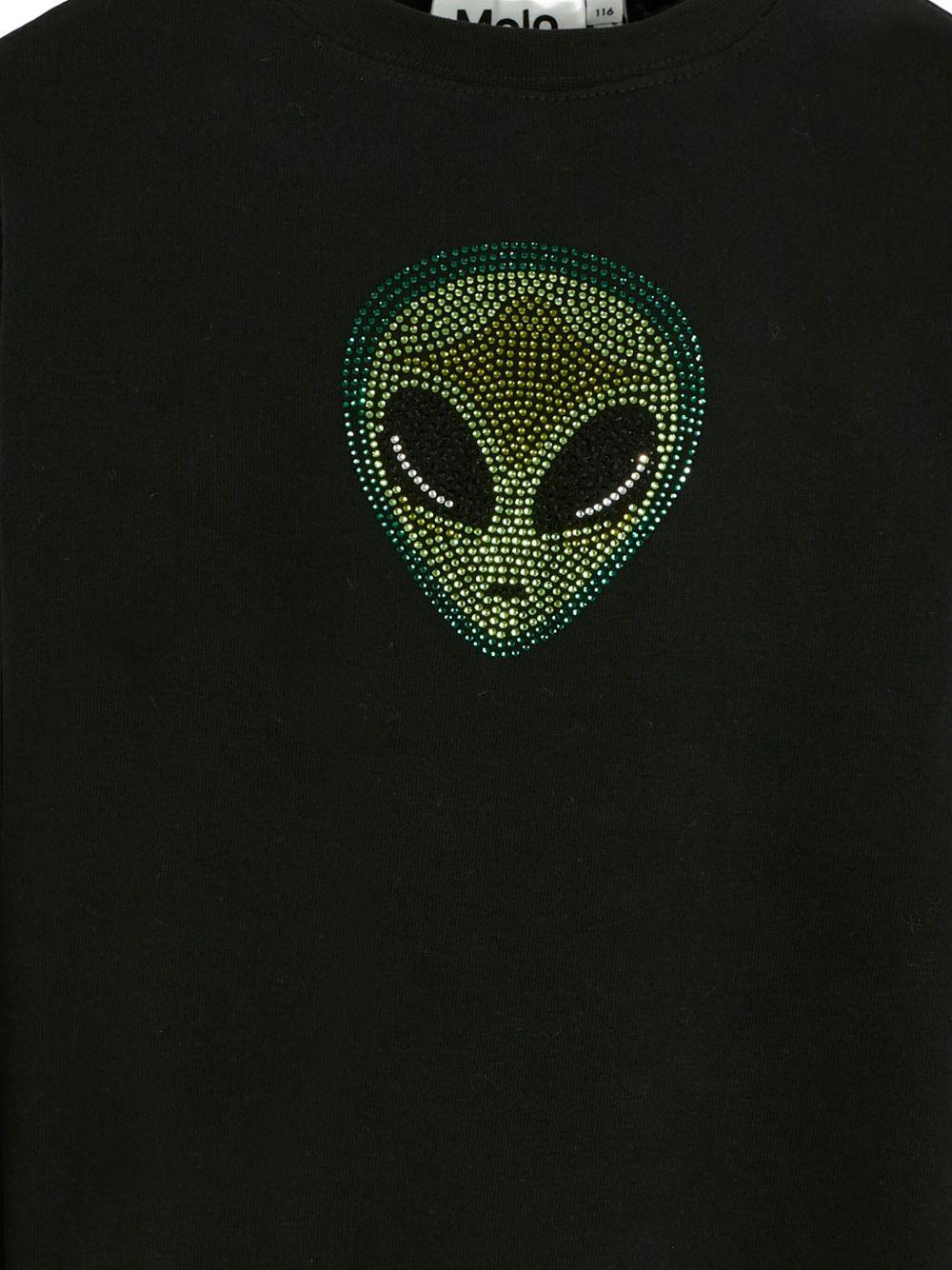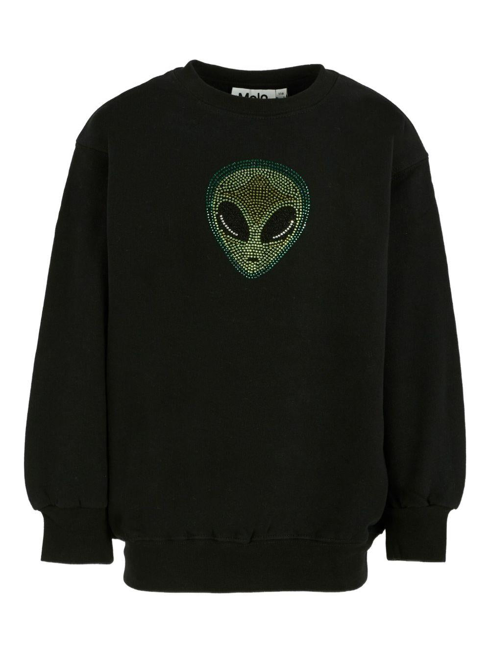 The Molo black alien head sweatshirt for boys is available on the RubinoKids.com online store. Made of 100% cotton, it features a black crew neck, an alien head motif, crystal embellishments, and long sleeves. Available in various sizes, it is part of the Donsje Fall/Winter 2025 collection and is available for 24-48 hour delivery in Italy.