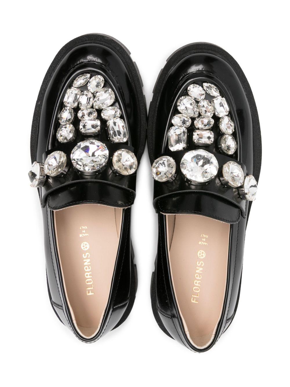 The Florens black moccasins for girls with crystal decorations are available on the RubinoKids.com online store. Made of 100% leather, they feature a black color, crystal decorations, a slip-on style, a round toe, and a rubber sole. Available in various sizes, they are part of the Florens Fall/Winter 2025 collection and are available for immediate shipment with delivery within 24-48 hours in Italy.