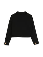 The Versace Kids black jacket for girls with engraved logo is available on the RubinoKids.com online store. Made of 63% polyester, 27% viscose, 7% cotton, 3% elastane. The blazer features a black cady texture, a front button closure, logo-engraved buttons, notched lapels, shoulder pads, long sleeves, buttoned cuffs, chest pockets with flaps and buttons, partial lining, and a straight hem. Available in various sizes, it is part of the Versace Kids Fall/Winter 2024 collection and is available for immediate shipment with delivery within 24-48 hours in Italy.