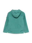 The CP Company green hooded jacket for boys is available on the RubinoKids.com online store. Made of 100% polyamide, it features a hidden front zipper, a forest green color, two zippered chest pockets, and two snap-button side pockets. Available in various sizes, it is part of the CP Company Kids Spring/Summer 2025 collection and is available for immediate shipment with delivery within 24-48 hours in Italy.