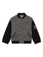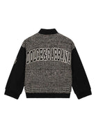 The Dolce & Gabbana Kids gray bomber jacket for boys with applique is available on the online store RubinoKids.com. Made of 65% wool, 14% polyester, 13% polyamide, 5% alpaca, 3% silk. The item features a wool blend, a color-block design, a checked pattern, a logo applique, a low ribbed collar, a front snap closure, dropped shoulders, long sleeves, two side welt pockets, a ribbed trim, and a straight hem. This size is part of the Dolce & Gabbana Kids Fall/Winter 2024 collection and is available for immediate shipment with delivery within 24-48 hours in Italy.