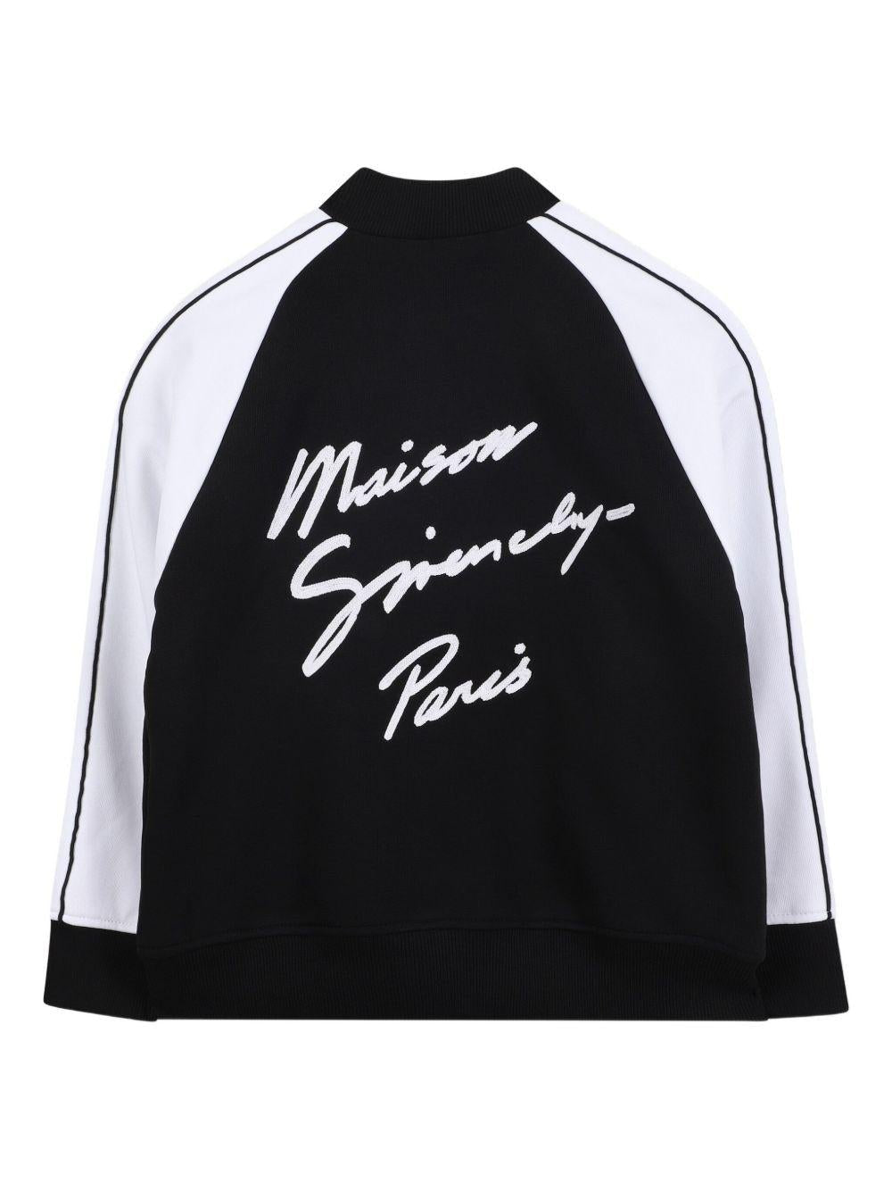 The Givenchy Kids black jacket with embroidered logo is available on the online store RubinoKids.com. Made from 85% organic cotton and 15% polyester, it features black, contrasting white inserts, a front button closure, an embroidered logo, a ribbed hem and cuffs, and a distinctive text design. Available in various sizes, it is part of the Givenchy Kids Fall/Winter 2025 collection and is available for 24/48 hour delivery in Italy.
