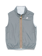 The K Way Kids gray reversible sleeveless jacket for boys is available on the RubinoKids.com online store. Made from 100% recycled nylon, it features a front zip closure, two side zip pockets, a reversible design, and a logo print on the chest. This size is part of the K Way Kids Spring/Summer 2025 collection and is available for immediate shipment with delivery within 24-48 hours in Italy.