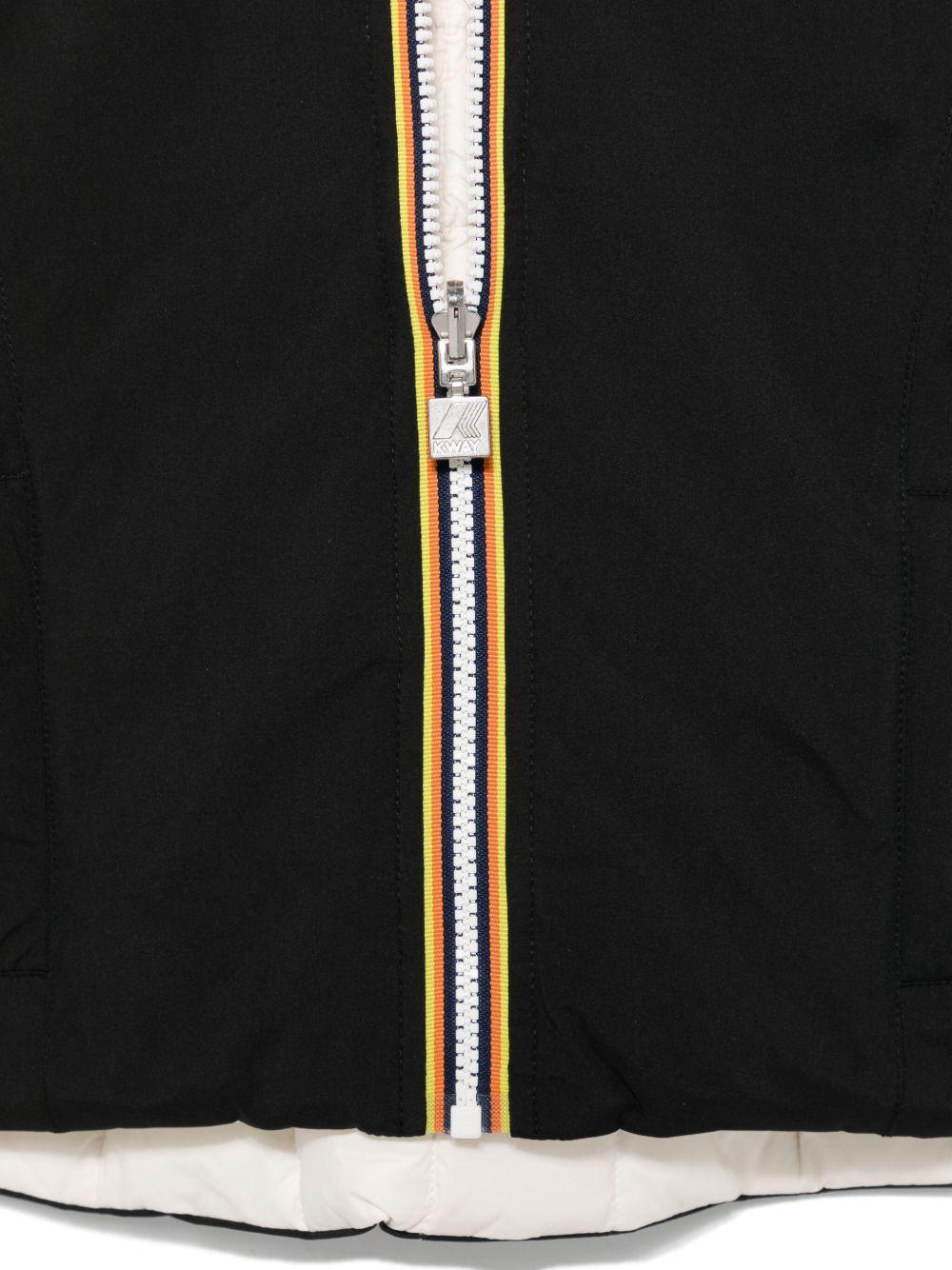The black K-Way Kids padded jacket for children with a padded design is available on the RubinoKids.com online store. Made of 100% cotton, it is black, reversible, features duck down, a padded design, a front zip closure, a high neck, a classic collar, a rubber logo detail, long sleeves, elasticated hems, two side zip pockets, and a fully lined interior. Available in various sizes, it is part of the K-Way Kids Fall/Winter 2025 collection and is available for 24-48 hour delivery in Italy.