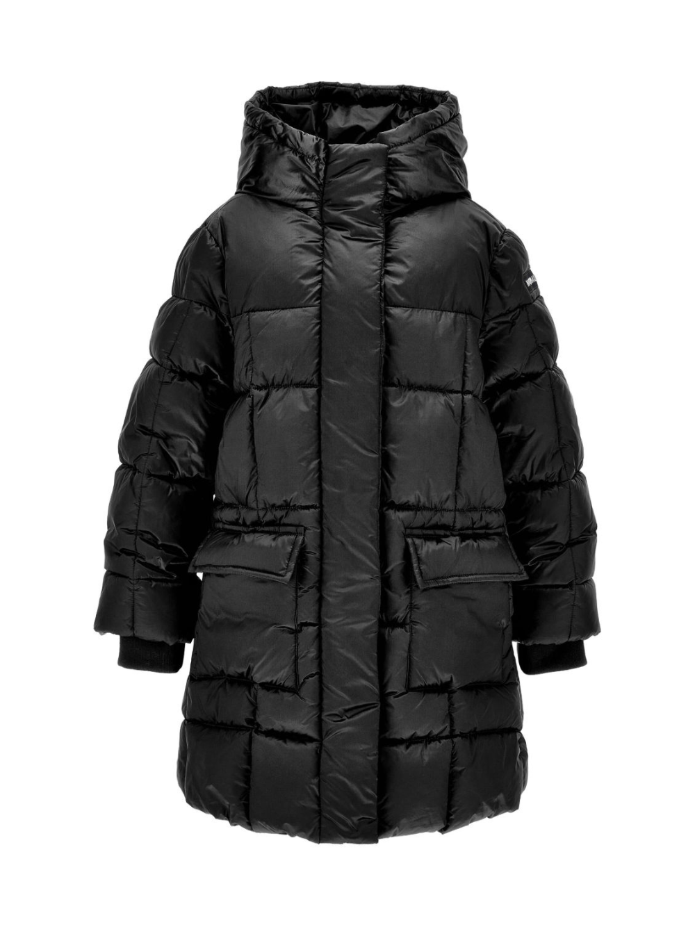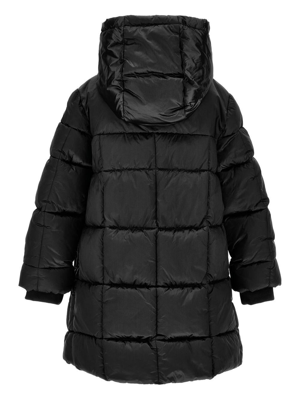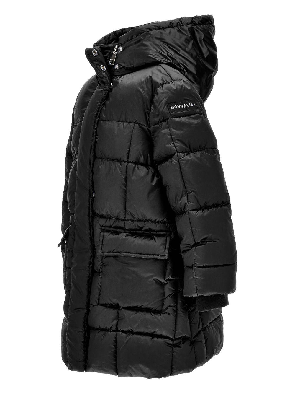 The Monnalisa black quilted down jacket with hood for girls is available on the RubinoKids.com online store. Made of 100% fabric, it features a black hood, padded squares, side pockets, a zip closure, and elasticated hems. Available in various sizes, it is part of the Monnalisa Fall/Winter 2025 collection and is available for 24-48 hour delivery in Italy.