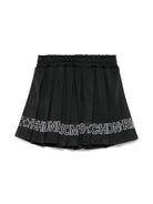 The John Richmond Junior black skirt with logo for girls is available on the RubinoKids.com online store. Made of 100% cotton, it features a black color, an elastic waist, a pleated skirt, and a flared hem. Available in various sizes, it is part of the John Richmond Junior Spring/Summer 2025 collection and is available for immediate shipment with delivery within 24-48 hours in Italy.