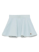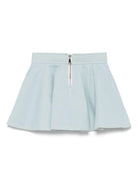 The Moncler Enfant light blue flared miniskirt for girls is available on the RubinoKids.com online store. Made of 100% cotton, it features a light blue color, a back zip closure, stitching detail, and a side logo patch. Available in various sizes, it is part of the Moncler Enfant Spring/Summer 2025 collection and is available for immediate shipment with delivery within 24-48 hours in Italy.