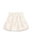 The Moschino Kids white heart-print miniskirt with ruffled hem for girls is available at the RubinoKids.com online store. Made of 73% polyester, 20% polyamide, and 7% metallic fiber, it features a metallic weave, a hidden side zip closure, a heart print, a gold-tone logo plaque, a fully lined hem, and a ruffled hem. This size is part of the Moschino Kids Fall/Winter 2024 collection and is available for immediate shipment with delivery within 24-48 hours in Italy.