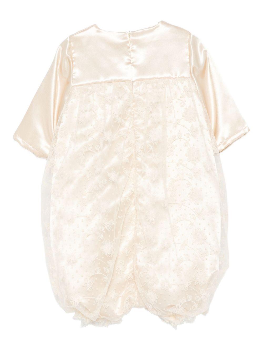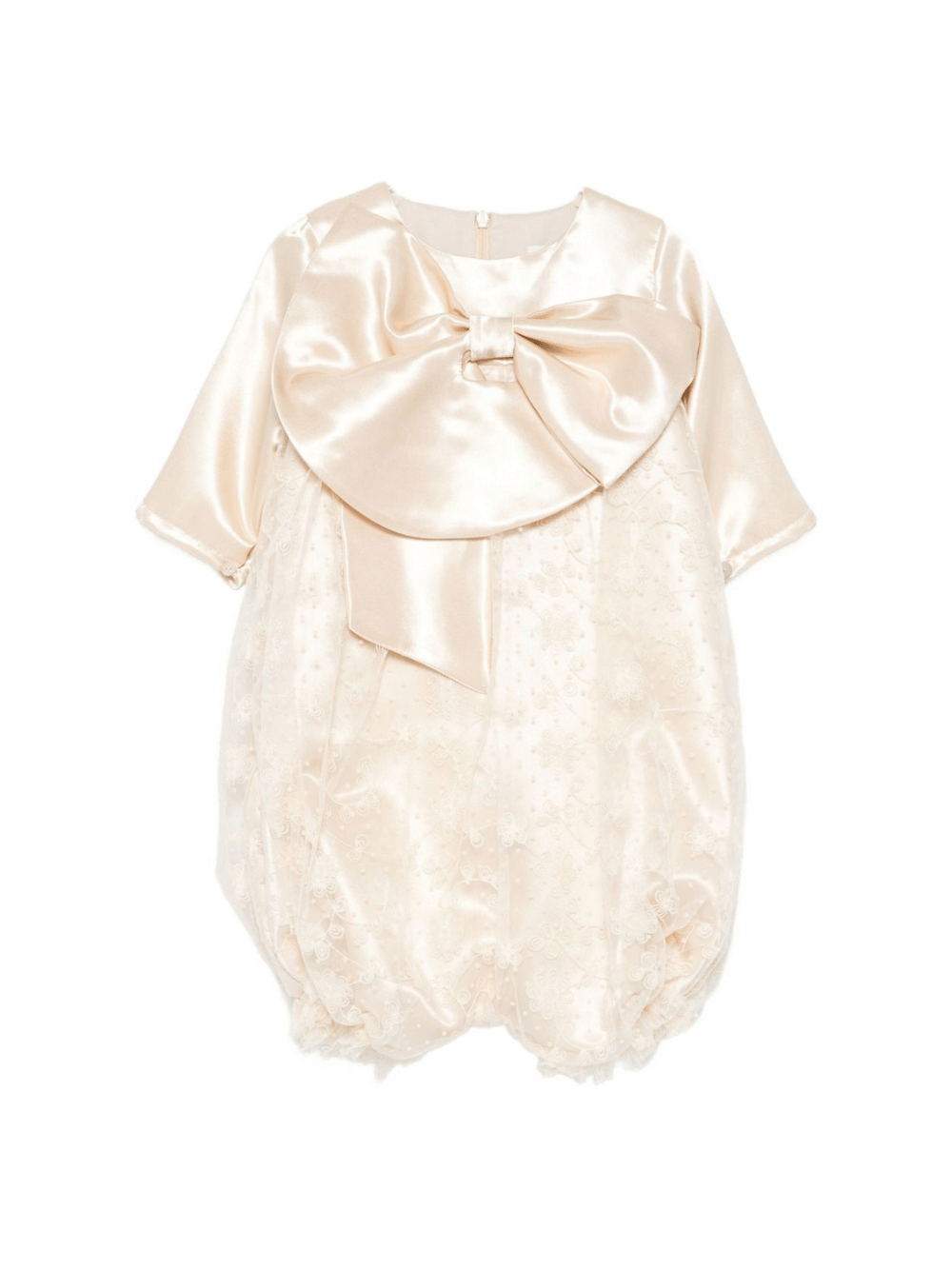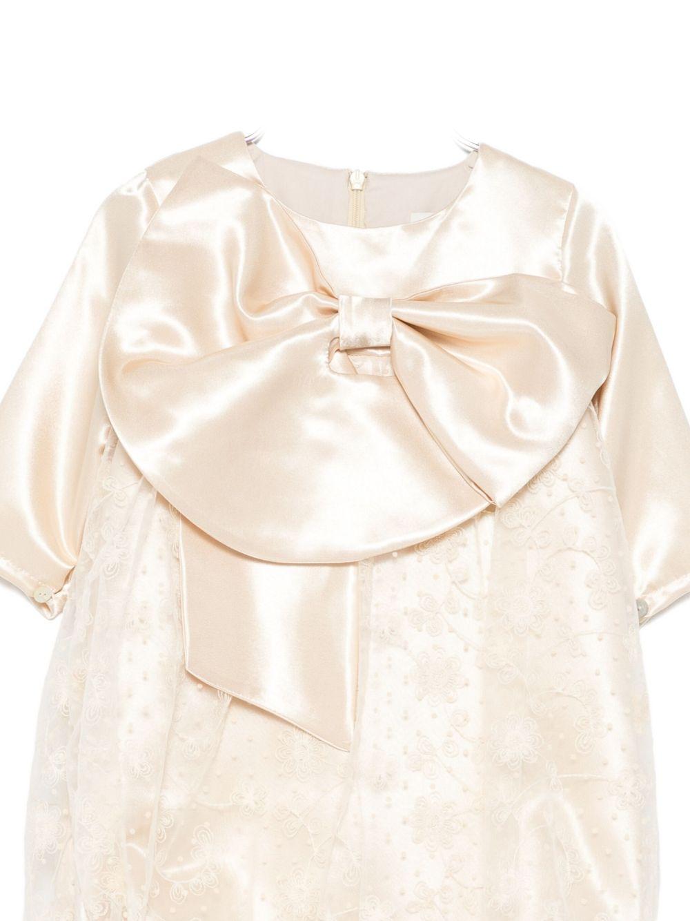 The A'lapage ecru dress for girls with a bow detail on the front is available on the RubinoKids.com online store. Made of 100% fabric, it features an ecru color, a bow detail, lace trim, short sleeves, a round neckline, and a button closure on the back. Available in various sizes, it is part of the A'lapage Fall/Winter 2025 collection and is available for 24-48 hour delivery in Italy.