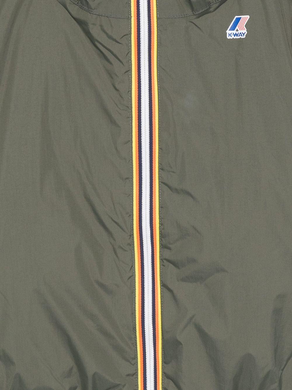 The K Way Kids Le Vrai green jacket with striped details for boys is available on the RubinoKids.com online store. Made of 100% nylon, it features a green color, a hooded neckline, a front zip closure, long sleeves, elasticated hems, and striped details. Available in various sizes, it is part of the K Way Kids Fall/Winter 2025 collection and is available for immediate shipment with delivery within 24-48 hours in Italy.