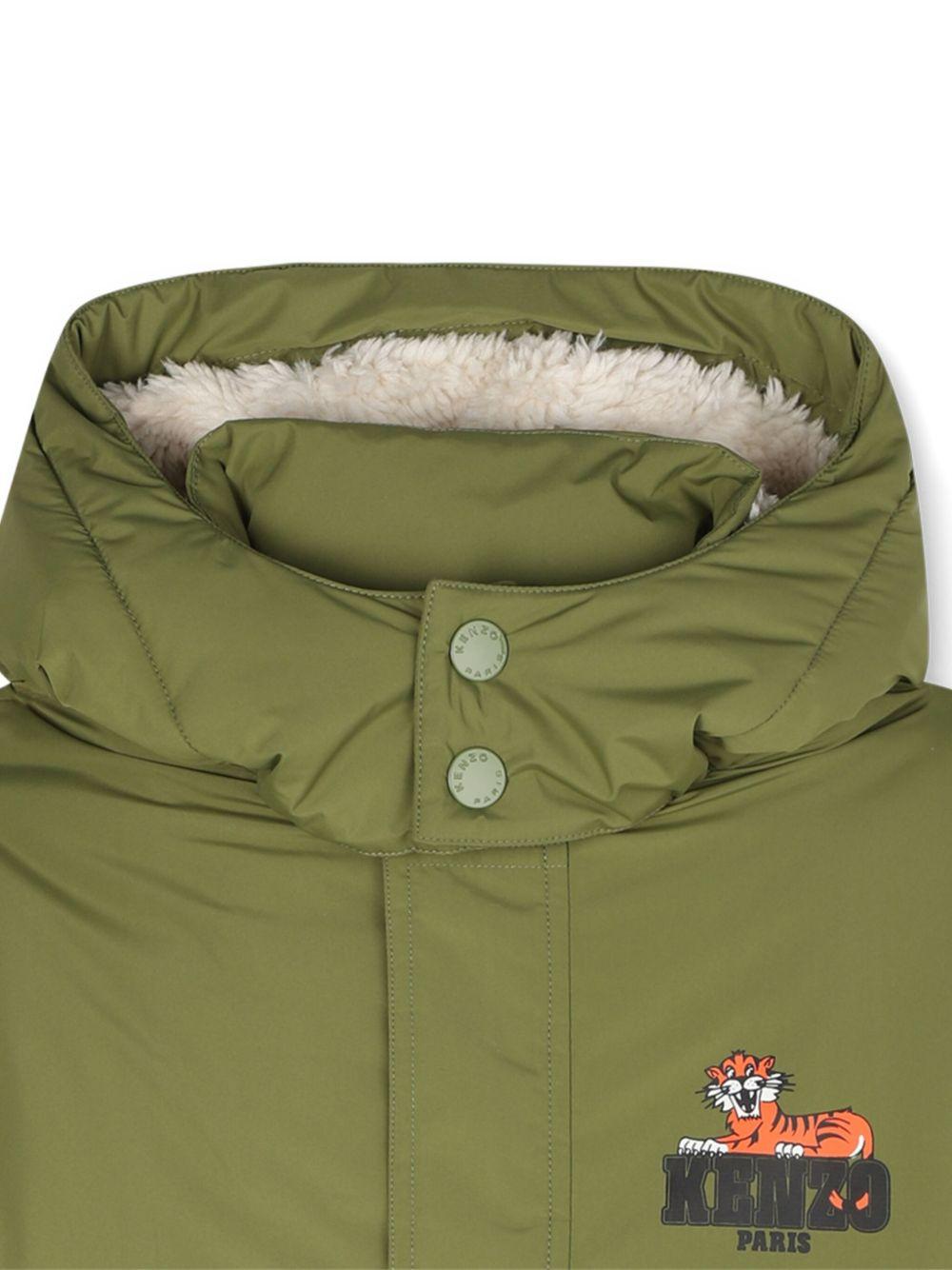 The Kenzo Kids green jacket with front pockets for boys is available on the RubinoKids.com online store. Made of 100% faux fur, 100% polyester, it features a green color, front pockets, a printed logo detail, a hood, and a front button closure. Available in various sizes, it is part of the Kenzo Kids Fall/Winter 2025 collection and is available for 24-48 hour delivery in Italy.