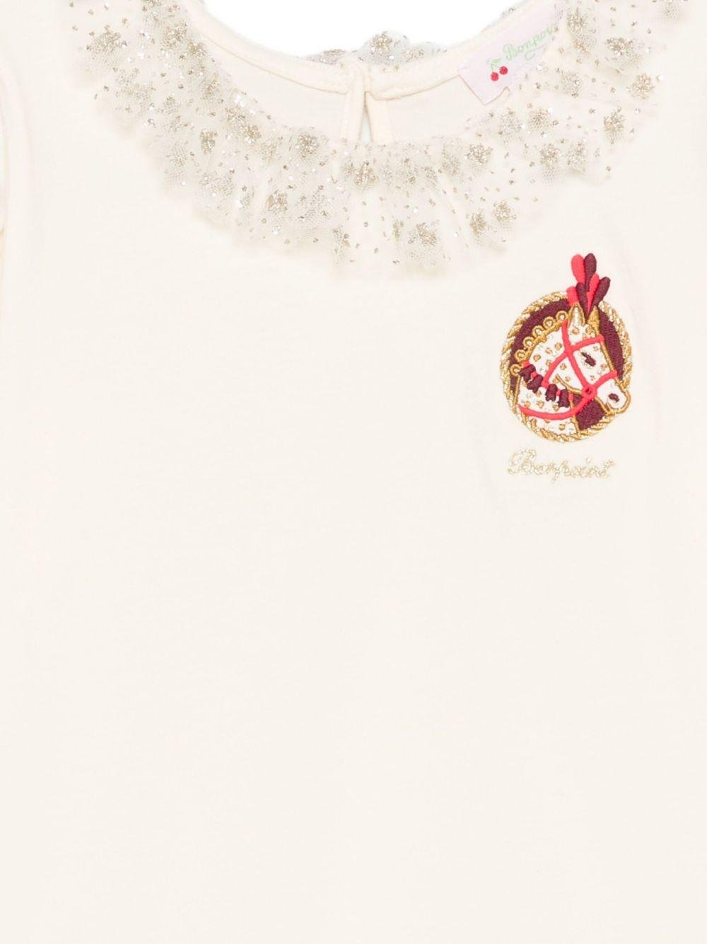 The Bonpoint Tidjany T-shirt for girls in white with embroidered details is available on the RubinoKids.com online store. Made of 100% cotton, it features a white color, embroidered details, a lace collar, long sleeves, a round neckline, and a pony embroidery on the front. Available in various sizes, it is part of the Boinpoint Fall/Winter 2025 collection and is available for delivery in 24/48 hours in Italy.