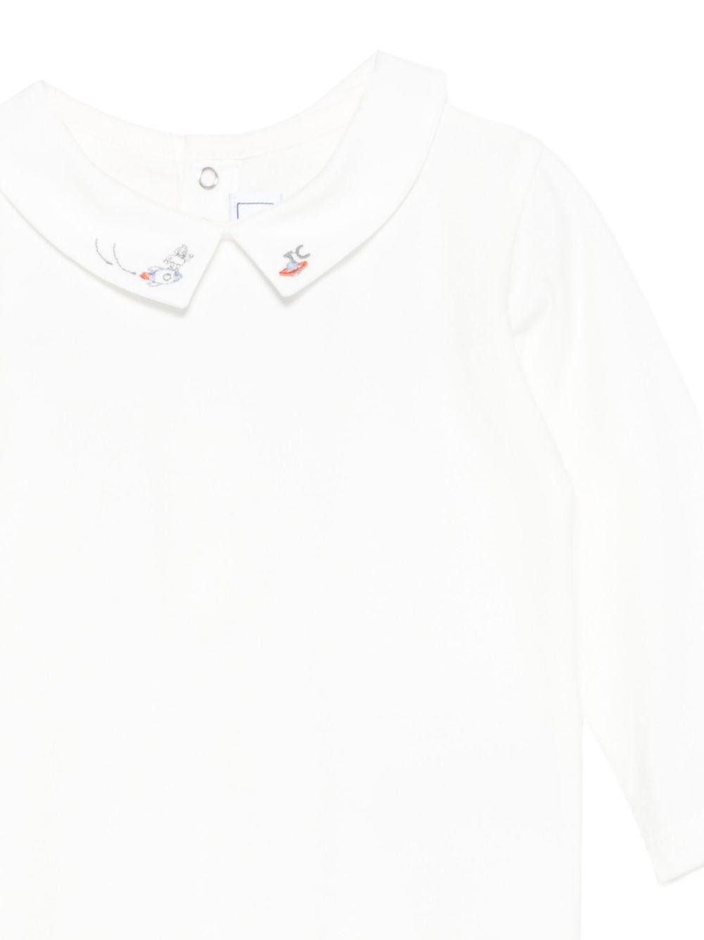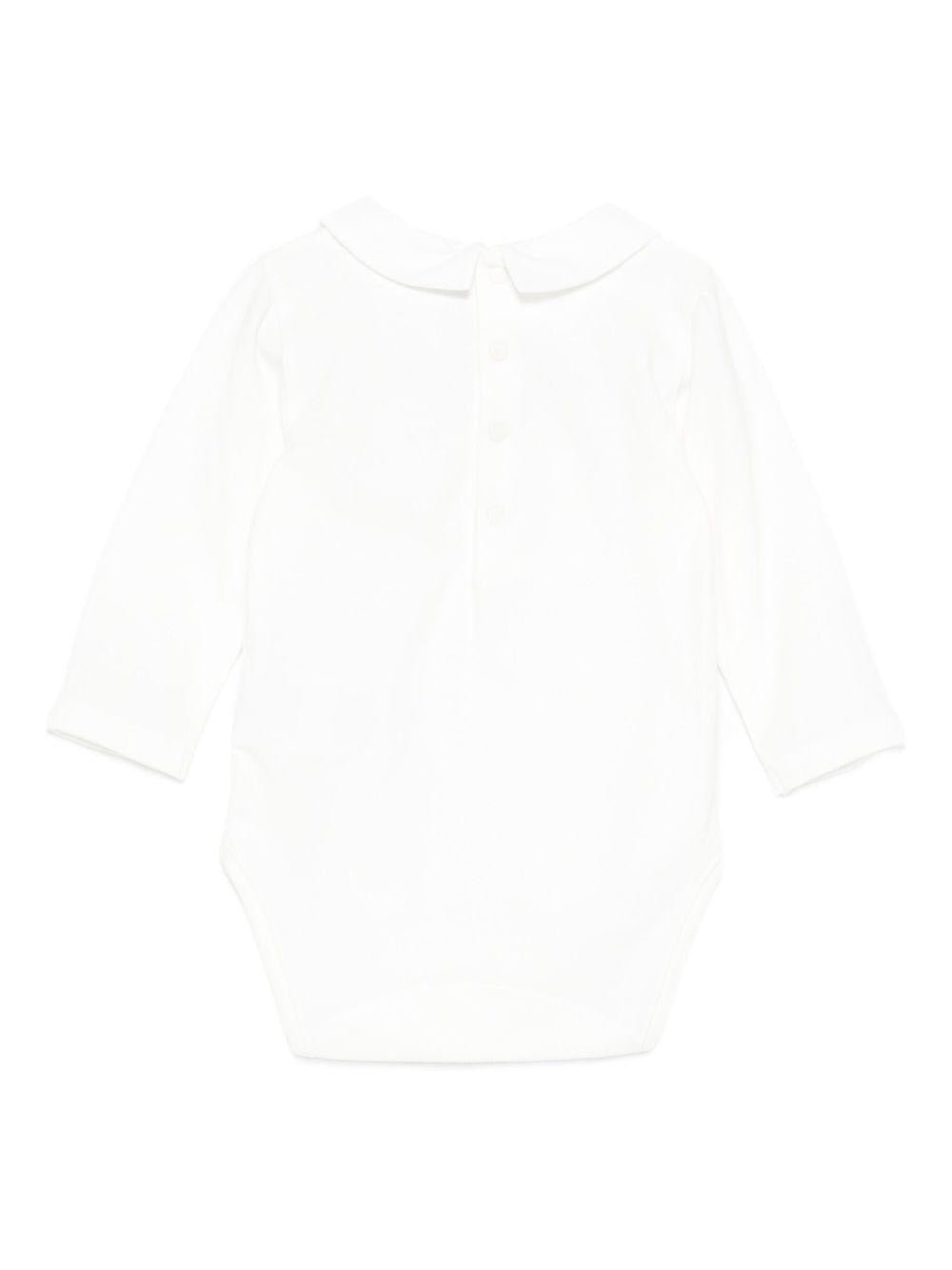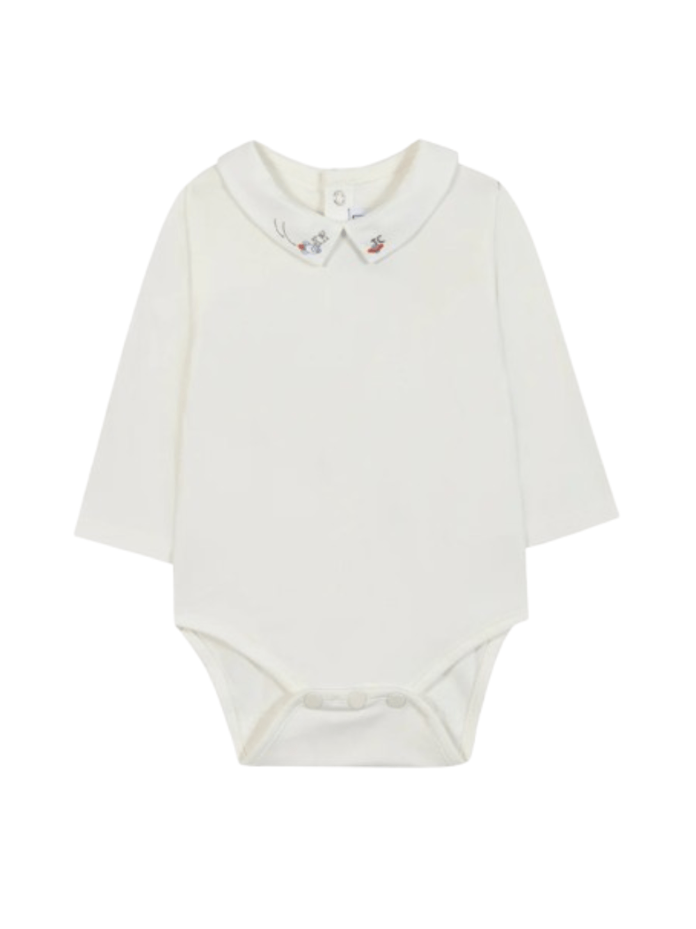 The Tartine Et Chocolat white baby onesie with embroidered detail is available on the RubinoKids.com online store. Made of 95% cotton, 5% elastane, it features white, long sleeves, a Peter Pan collar, embroidered detail, and a snap closure. Available in various sizes, it is part of the Tartine Et Chocolat Fall/Winter 2025 collection and is available for 24-48 hour delivery in Italy.