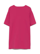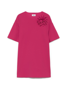 The Il Gufo red floral dress with short sleeves for girls is available on the RubinoKids.com online store. Made of 74% polyamide, 26% elastane, it features a raspberry color, a crew neck, short sleeves, and a straight hem. Available in various sizes, it is part of the Il Gufo Spring/Summer 2025 collection and is available for immediate shipment with delivery within 24-48 hours in Italy.