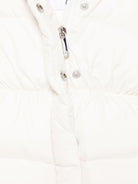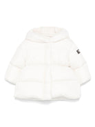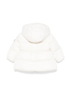 The Il Gufo white quilted baby girl's padded jacket is available on the RubinoKids.com online store. Made of 100% polyester, it features goose down padding, a quilted design, a concealed front closure with snaps and a zip, a hood, long sleeves, a logo patch on the sleeve, elasticated hems, two side welt pockets, a cotton lining, a cruelty-free fur lining, and a straight hem. This size is part of the Il Gufo Fall/Winter 2024 collection and is available for immediate shipment with delivery within 24-48 hours in Italy.