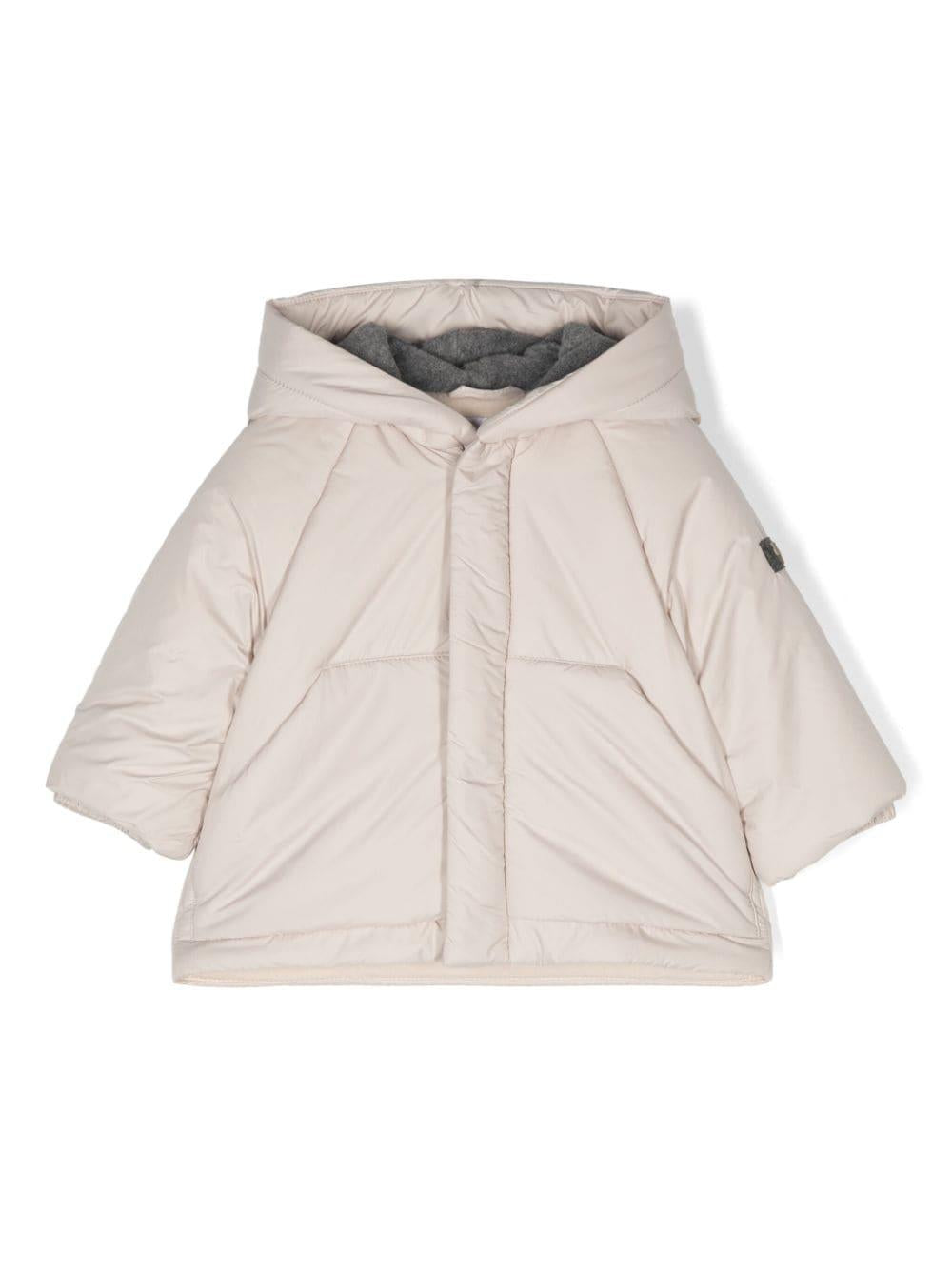 The beige Il Gufo hooded down jacket with appliqué for newborns is available on the RubinoKids.com online store. Made of 100% polyester, it features a logo appliqué on the sleeve, a concealed front zip closure, a padded design, a hood, long raglan sleeves, elasticated hems, two front kangaroo pockets, a cotton lining, and a straight hem. This size is part of the Il Gufo Fall/Winter 2024 collection and is available for immediate shipment with delivery within 24-48 hours in Italy.