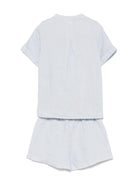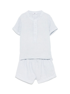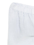 The Il Gufo gray linen baby boy's shorts set is available on the RubinoKids.com online store. Made from 100% linen, it features a light gray color, a short front button closure, an elastic waistband, box pleat detailing, and short sleeves. Available in various sizes, it is part of the Il Gufo Spring/Summer 2025 collection and is available for immediate shipment with delivery within 24-48 hours in Italy.