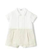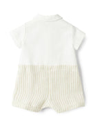The Il Gufo white short-sleeved baby onesie is available on the RubinoKids.com online store. Made from 100% cotton, it features a white color, a front button closure, a snap closure, and a striped print. Available in various sizes, it is part of the Il Gufo Spring/Summer 2025 collection and is available for immediate shipment with delivery within 24-48 hours in Italy.