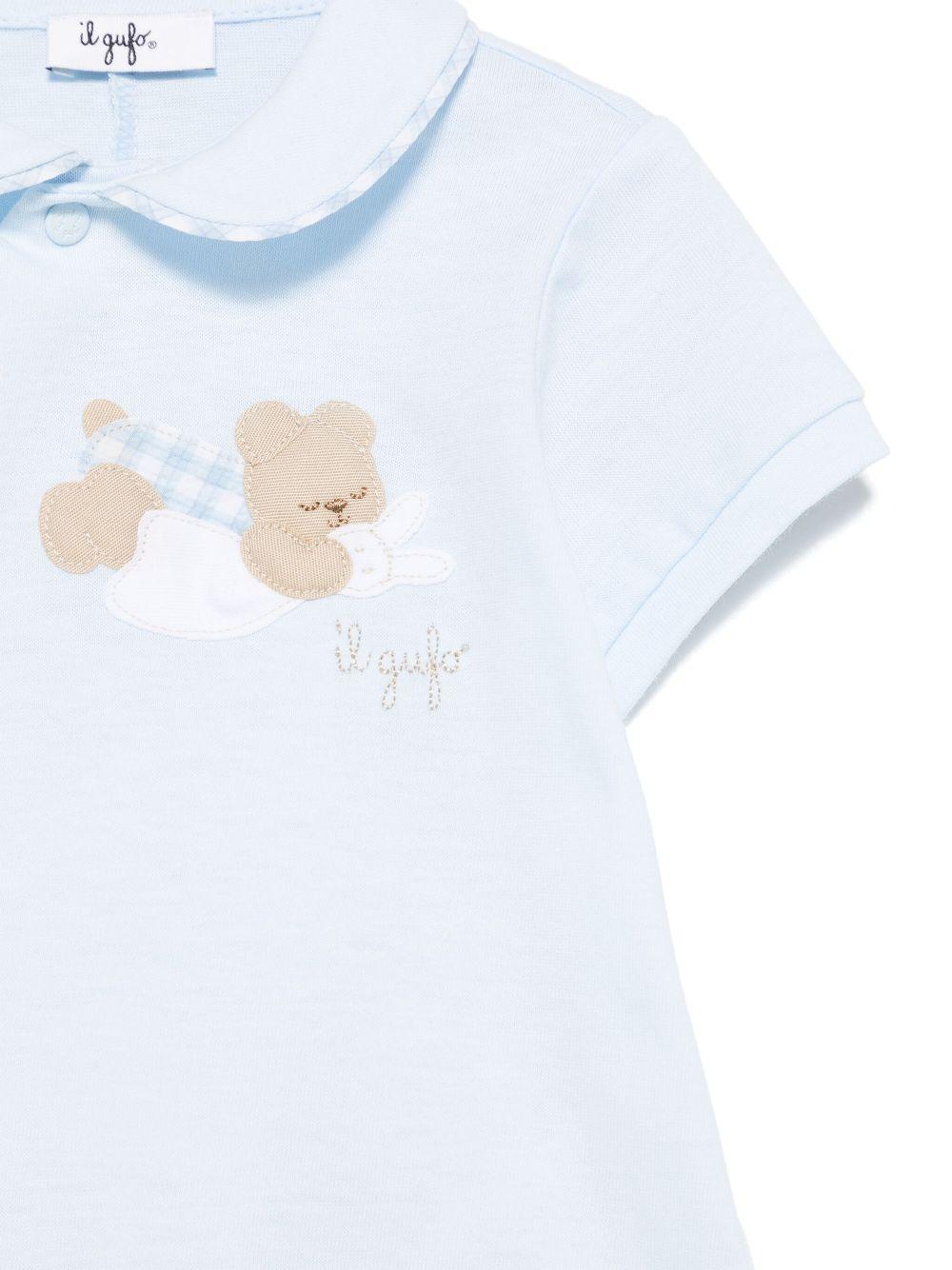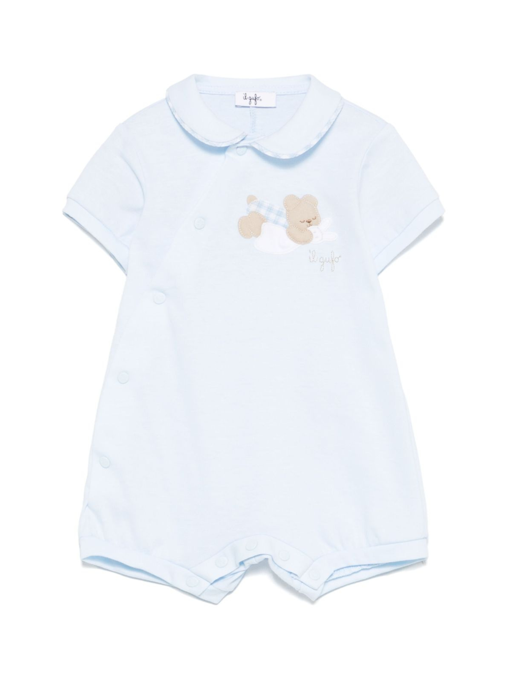 The Blue Owl Baby Onesie with Teddy Bear Motif and Round Collar