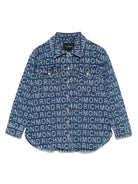 The John Richmond Junior girls' denim shirt with jacquard logo is available on the RubinoKids.com online store. Made from 100% cotton, it features an indigo blue color, a button-up front, two patch pockets on the chest, a classic collar, and long sleeves. Available in various sizes, it is part of the John Richmond Junior Spring/Summer 2025 collection and is available for immediate shipment with delivery within 24-48 hours in Italy.