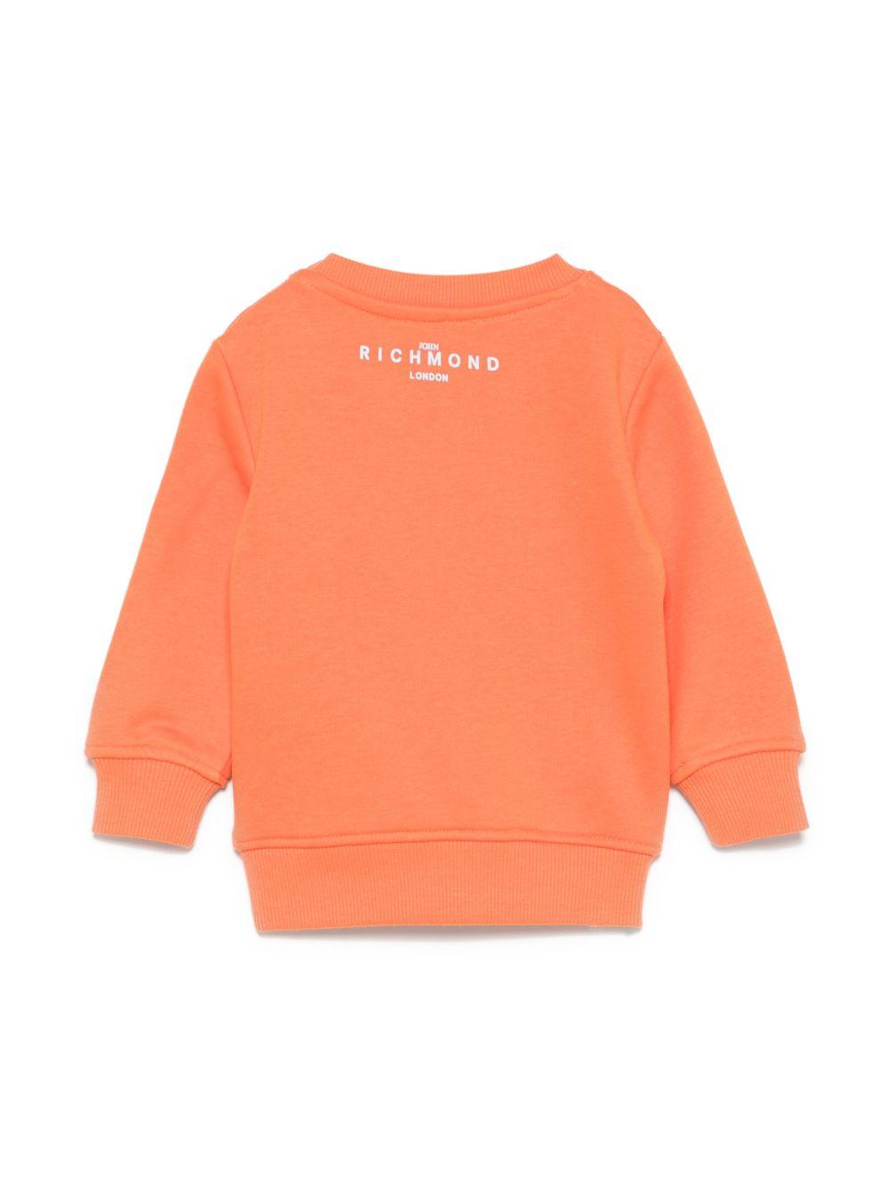 The John Richmond Junior orange baby sweatshirt with shoulder buttons is available on the RubinoKids.com online store. Made of 100% cotton, it features long sleeves, a crew neck, ribbed cuffs and hem, and a straight hem. Available in various sizes, it is part of the John Richmond Junior Spring/Summer 2025 collection and is available for immediate shipment with delivery within 24-48 hours in Italy.