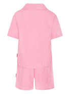 The John Richmond Junior pink shorts set for girls with jacquard logo is available on the RubinoKids.com online store. Made of 50% viscose and 50% cotton, the bubblegum pink item features a front button closure, a lapel collar, and short sleeves. Available in various sizes, it is part of the John Richmond Junior Spring/Summer 2025 collection and is available for immediate shipment with delivery within 24-48 hours in Italy.