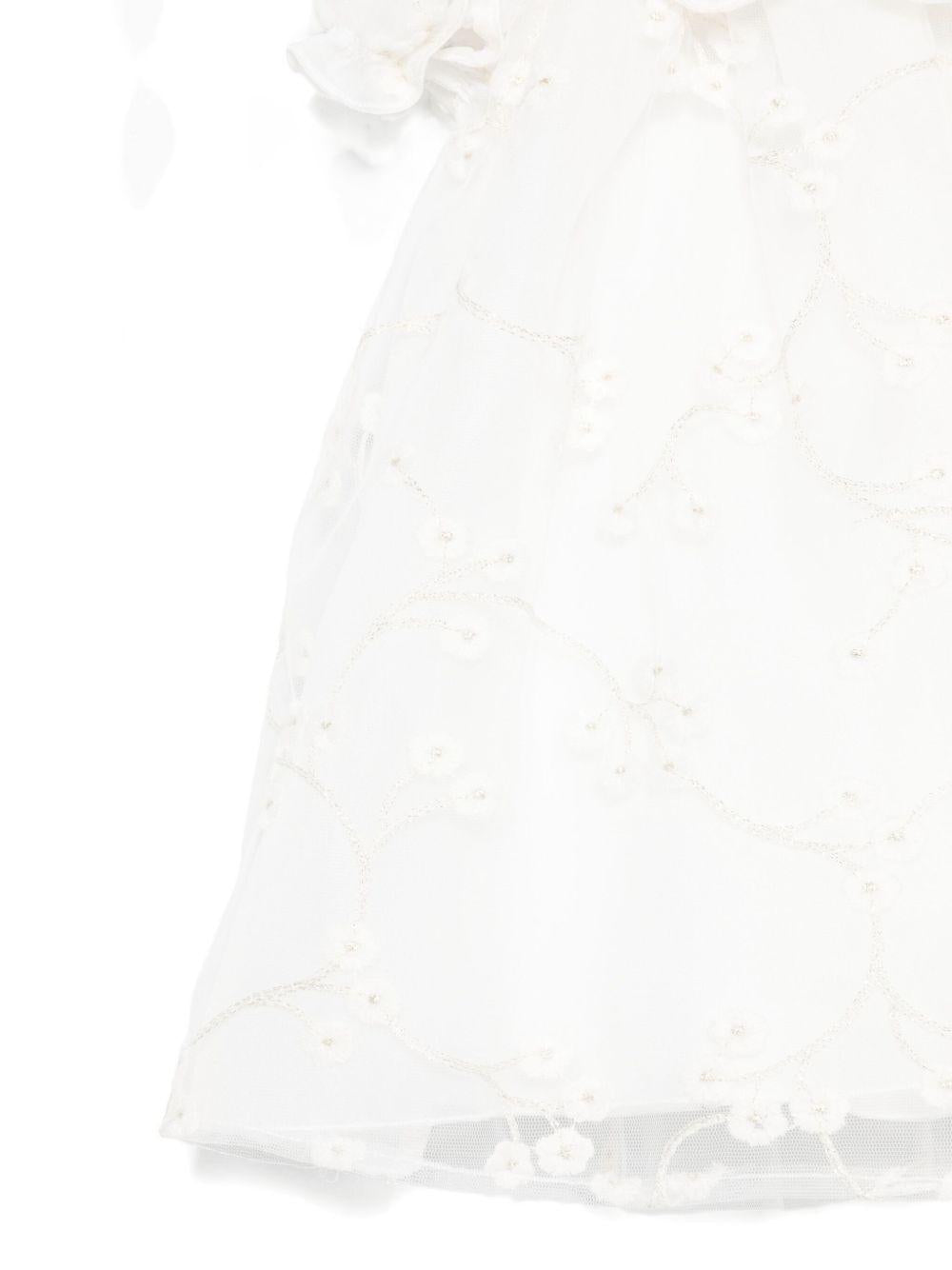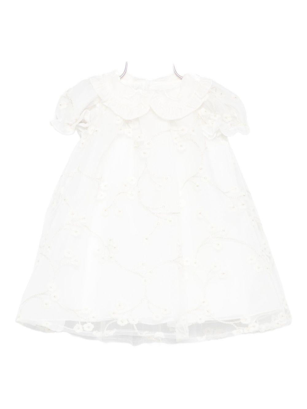 The La Stupenderia white baby girl dress with Peter Pan collar is available on the RubinoKids.com online store. Made from 30% wool, 25% viscose, 25% polyester, and 20% polyamide, it features a white Peter Pan collar, an embroidered floral motif, and short sleeves. Available in various sizes, it is part of the La Stupenderia Fall/Winter 2025 collection and is available for 24-48 hour delivery in Italy.