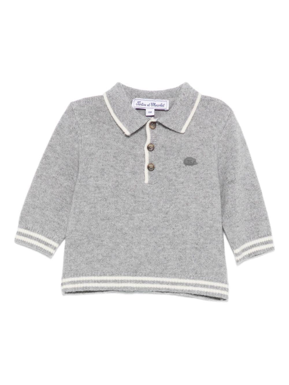 The Tartine Et Chocolat gray baby polo shirt with polo collar is available on the RubinoKids.com online store. Made of 100% wool, it features a gray color, a polo collar, button closure, white trim, an embroidered logo, and long sleeves. Available in various sizes, it is part of the Tartine Et Chocolat Fall/Winter 2025 collection and is available for 24-48 hour delivery in Italy.