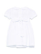 The Mariella Ferrari white baby girl dress with smocked insert is available on the RubinoKids.com online store. Made of 100% cotton, it features a white color, a back button closure, a back tie closure, a smocked insert, and short puff sleeves. Available in various sizes, it is part of the Mariella Ferrari Spring/Summer 2025 collection and is available for immediate shipment with delivery within 24-48 hours in Italy.