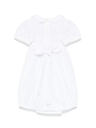 The Mariella Ferrari white linen baby girl's bodysuit is available on the RubinoKids.com online store. Made of 100% linen, it features a white button closure, a Peter Pan collar, short sleeves, and an embroidered motif. Available in various sizes, it is part of the Mariella Ferrari Spring/Summer 2025 collection and is available for immediate shipment with delivery within 24-48 hours in Italy.