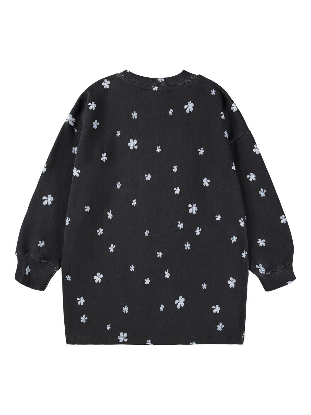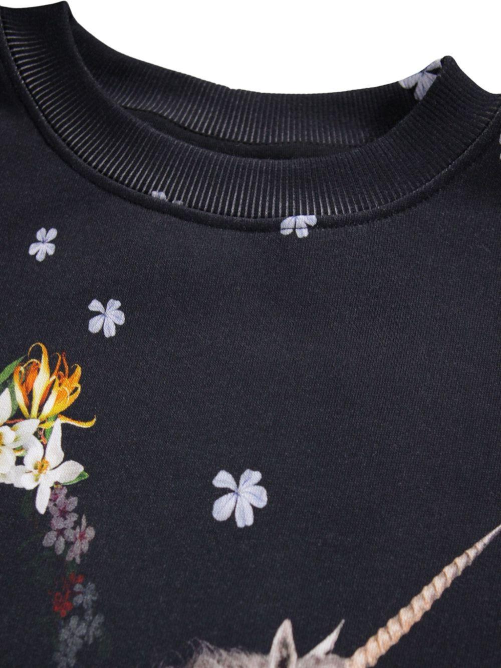 The Molo girls' black sweatshirt with unicorn graphic is available on the RubinoKids.com online store. Made of 100% cotton, it features a black color, a unicorn graphic design, floral detail, an all-over floral print, a crew neck, and dropped shoulders. Available in various sizes, it is part of the Molo Fall/Winter 2025 collection and is available for 24-48 hour delivery in Italy.