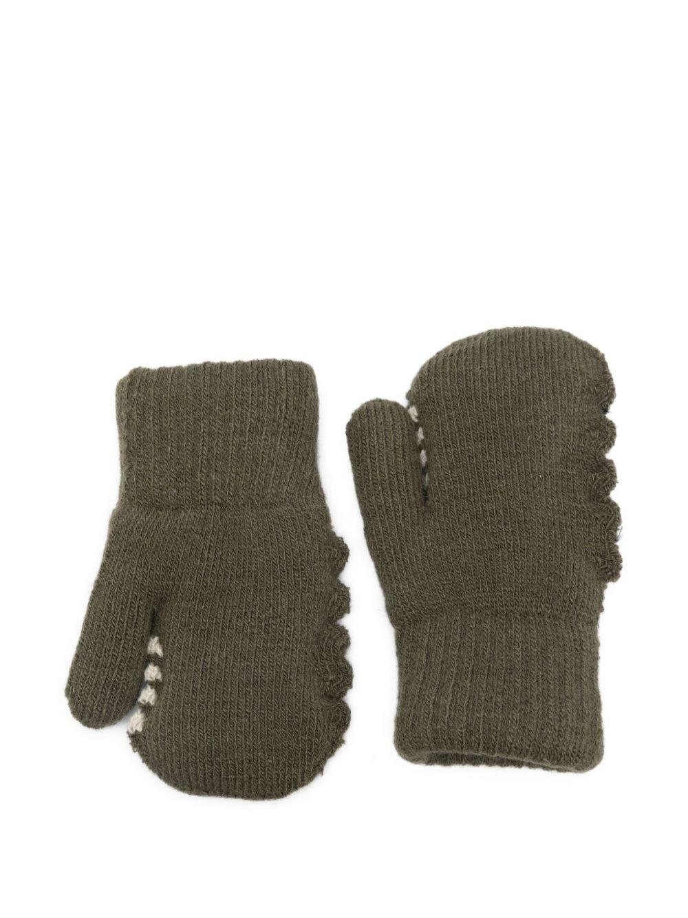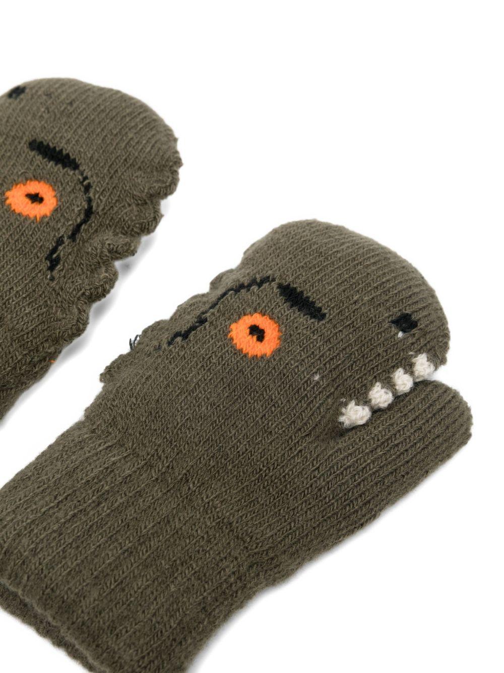 The Molo green dinosaur face gloves for children are available on the RubinoKids.com online store. Made of 83% acrylic, 15% polyester, and 2% elastane, they feature a green dinosaur face, embroidered details, and scalloped edges. Available in various sizes, they are part of the Molo Fall/Winter 2025 collection and are available for 24-48 hour delivery in Italy.