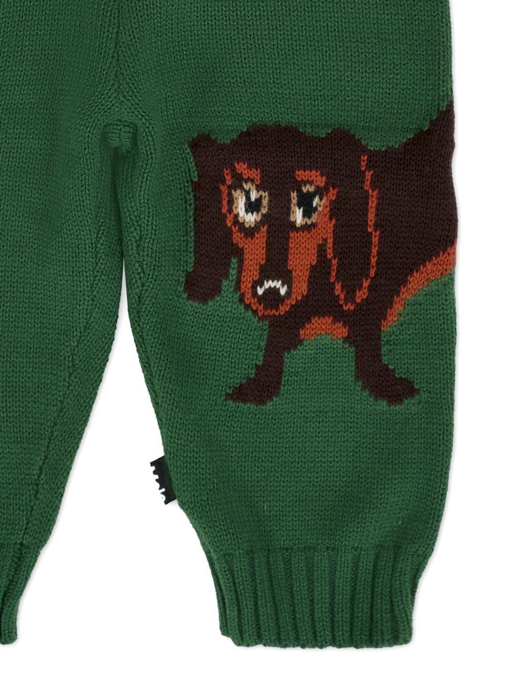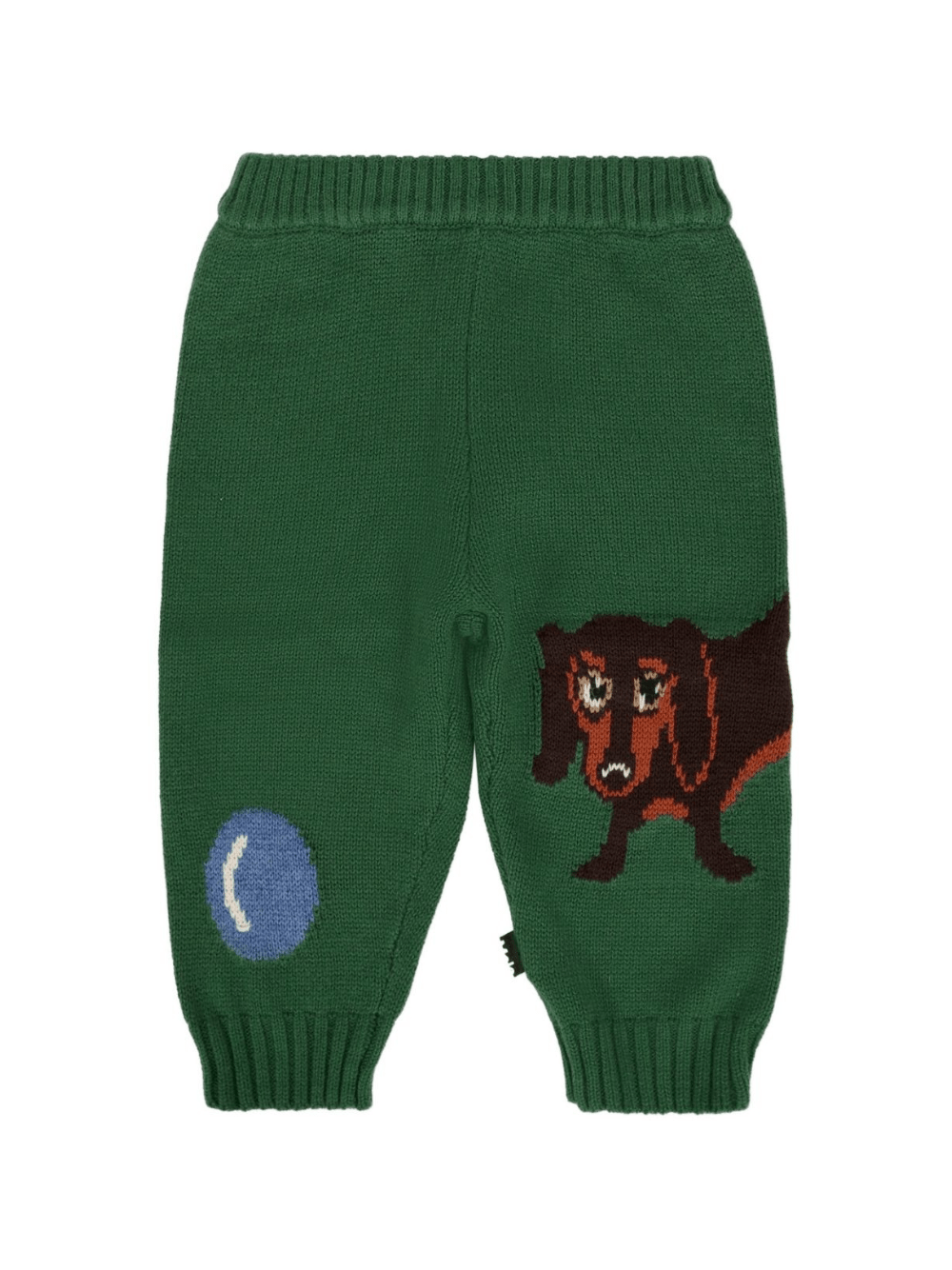 The Molo baby pants in green with a dachshund print are available on the RubinoKids.com online store. Made from 80% cotton and 20% wool, they feature a green color, a dachshund motif, a knit, ribbed cuffs, and an elastic waistband. Available in various sizes, they are part of the Molo Fall/Winter 2025 collection and are available for delivery in Italy within 24-48 hours.