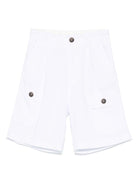 The Paolo Pecora Kids white pleated shorts for boys with a front fastening are available on the RubinoKids.com online store. Made of 80% viscose and 20% linen, they feature a front button and zip closure, two diagonal side pockets, a front flap pocket, and a front patch pocket. This size is part of the Paolo Pecora Kids Spring/Summer 2025 collection and is available for immediate shipment with delivery within 24-48 hours in Italy.